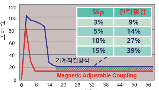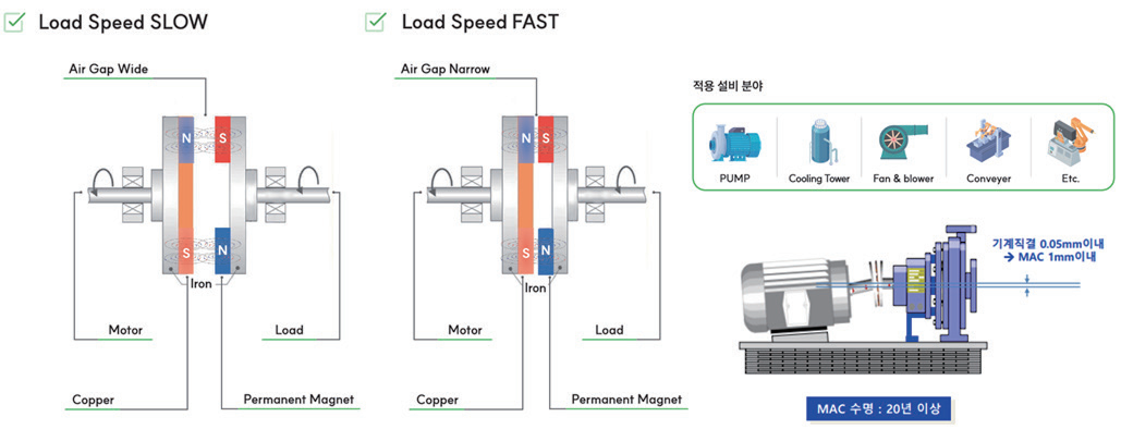 기계적 연결없이 영구자석의 자력과 동(Copper)의 금속적 특성을 이용해 발생하는 자력으로 모터측의 동력을 부하측으로 전달하는 방식. 모터와 부하측 간극(Air Gap) 조정을 통해 부하측 회전수를 조절하여 전력을 절감하는 장치.